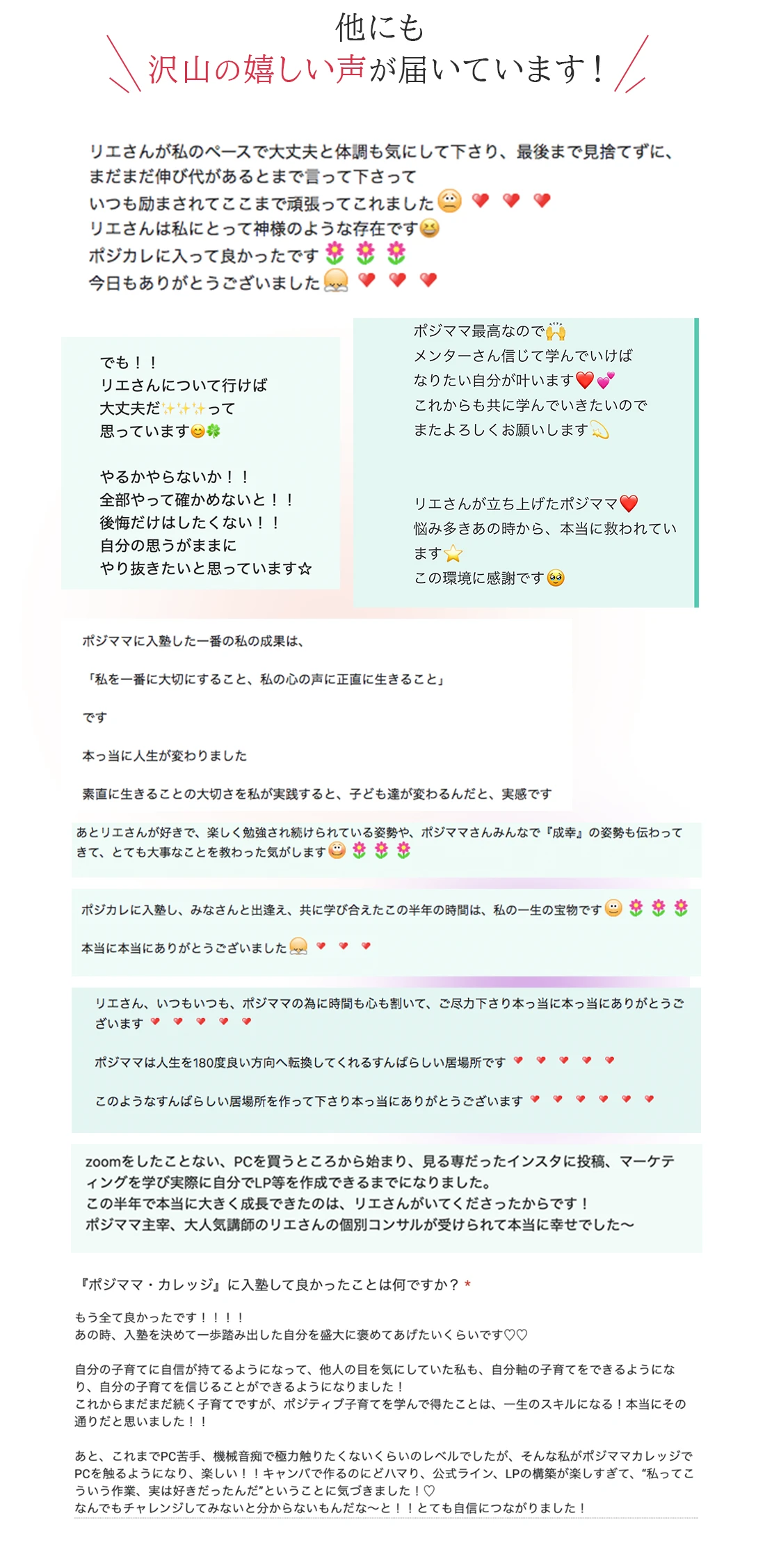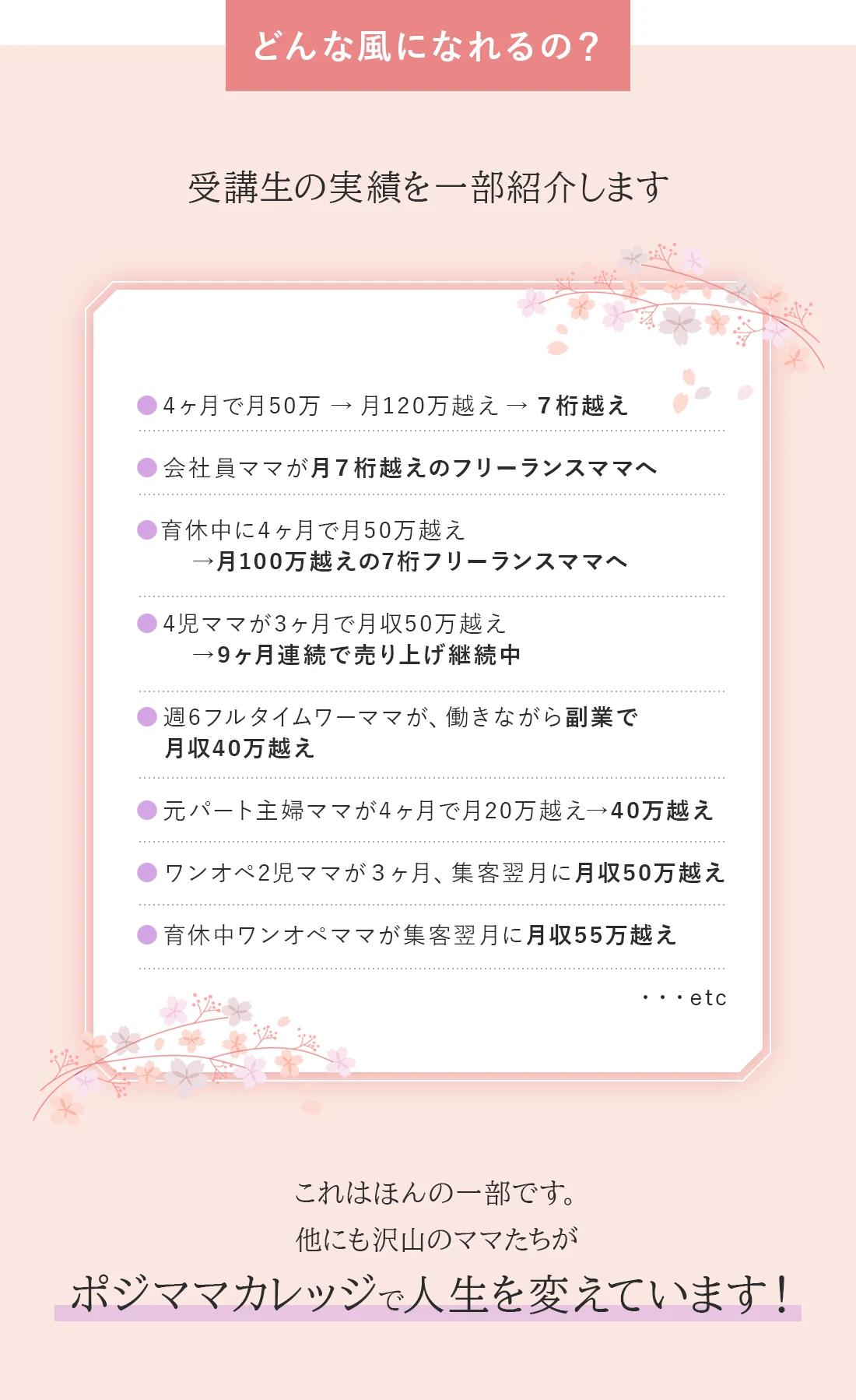 そして何年も働き方に悩んできた私でも、ボジママ講座生の間に、会社員・時短で働く以上の収入を得られたのは、『ポジママカレッジ』だったからだと思います。