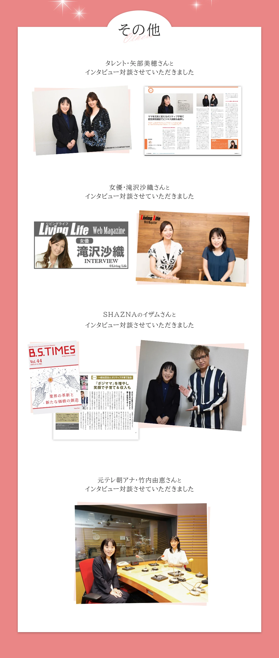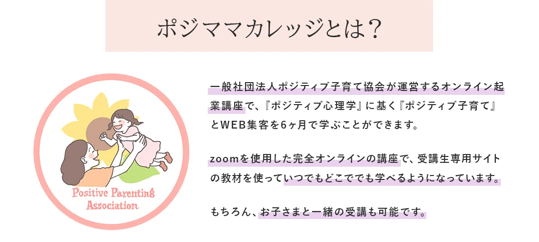 『自立したママさんが増えてほしい』という思いと、「私は子育てしかしていない。」と専業主婦の母がよく愚痴っていたことから「子育てしかしてない」ではなくて、『子育てというスキル』を仕事にしてほしいとの思いで『ポジティブ子育て協会』を設立し、『ポジママ・カレッジ』を運営しています。